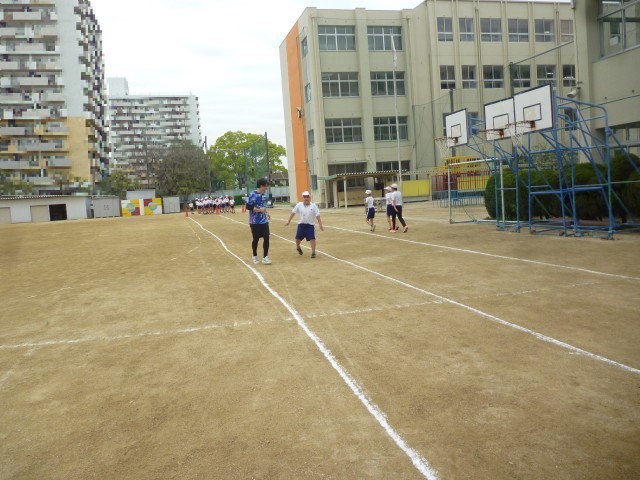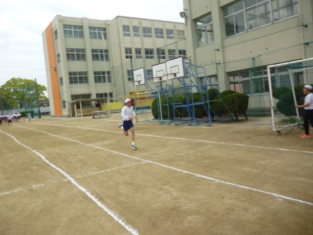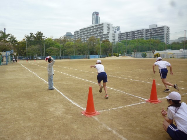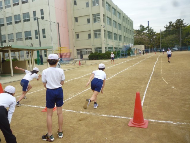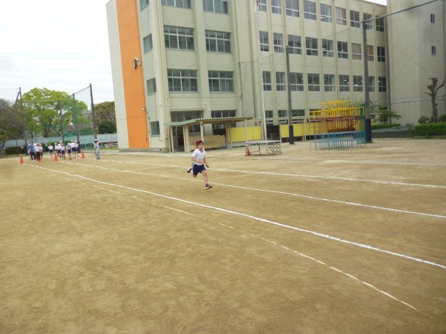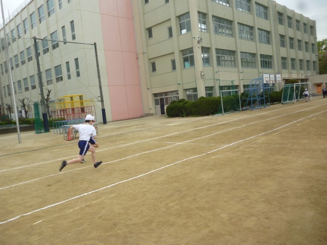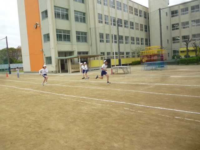 運動場で、50m走をしました。みんな全力で走っています。5月には、スポーツテストがあります。また、6月にはトップアスリート夢授業で、陸上競技を教えていただく予定です。