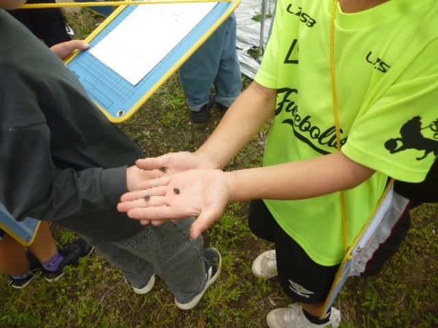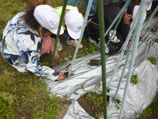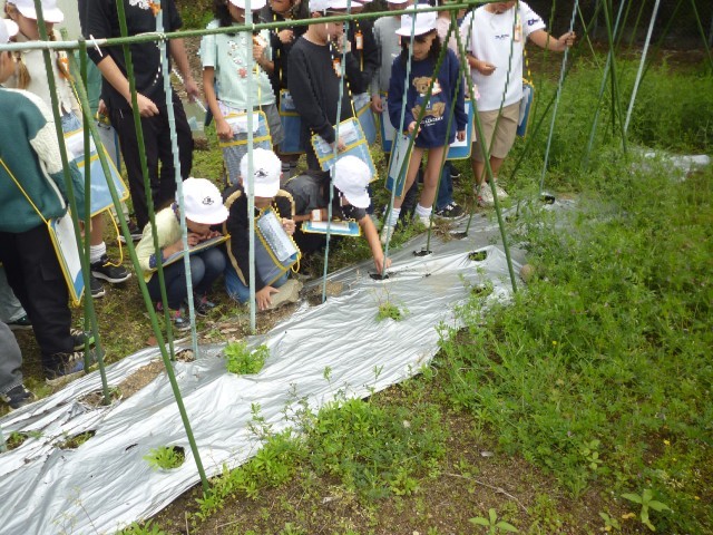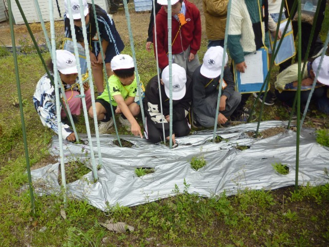ヘチマのたねを、学習園の畑に植えました。そして、春の植物を観察し、タブレットでさつえいしました。これから、季節ごとに生き物の変化を観察していきます。
