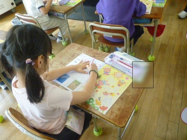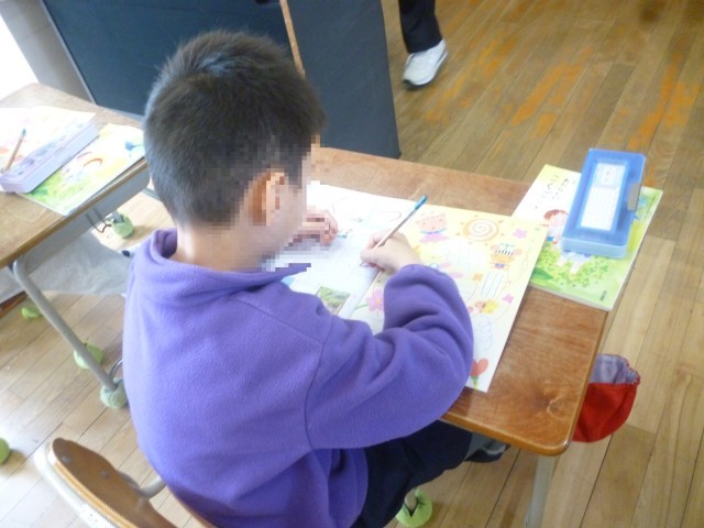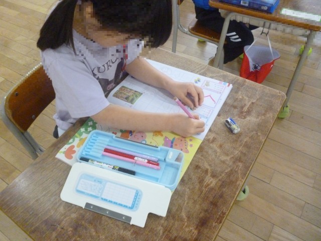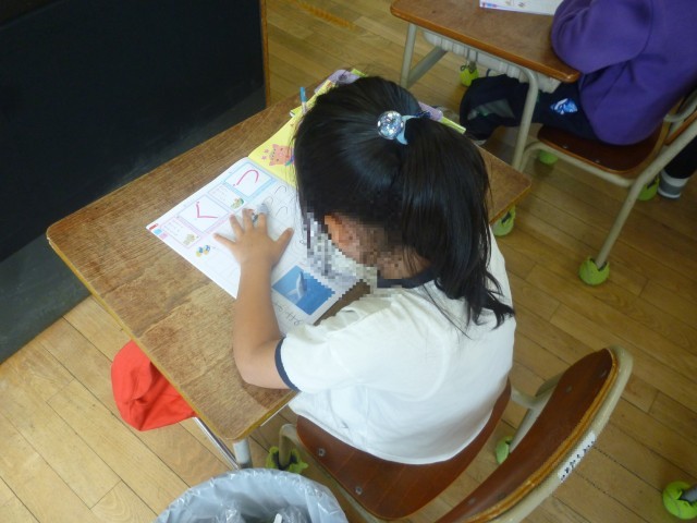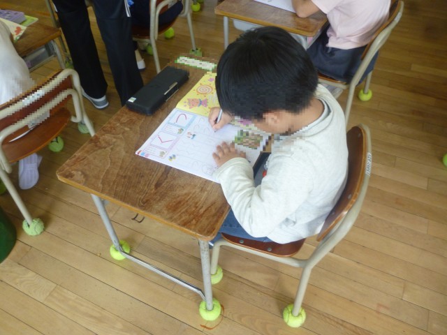 はじめてのひらがなのがくしゅうです。さいしょにならうじは「つ」です。えんぴつのもちかたや、かくしせいにきをつけてかいています。