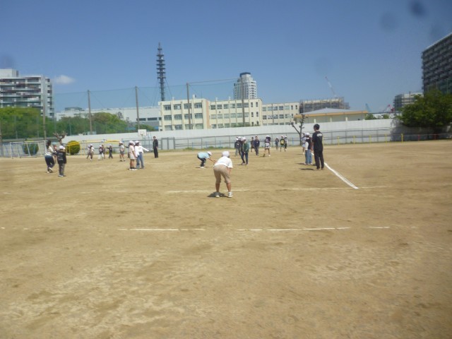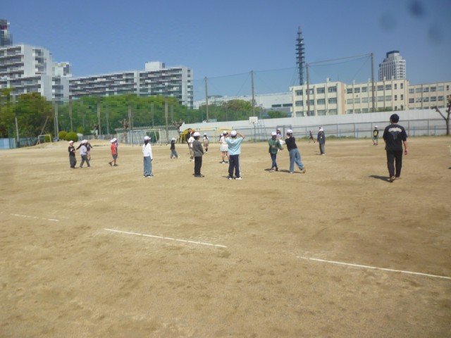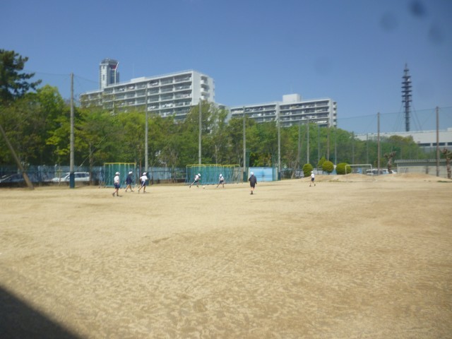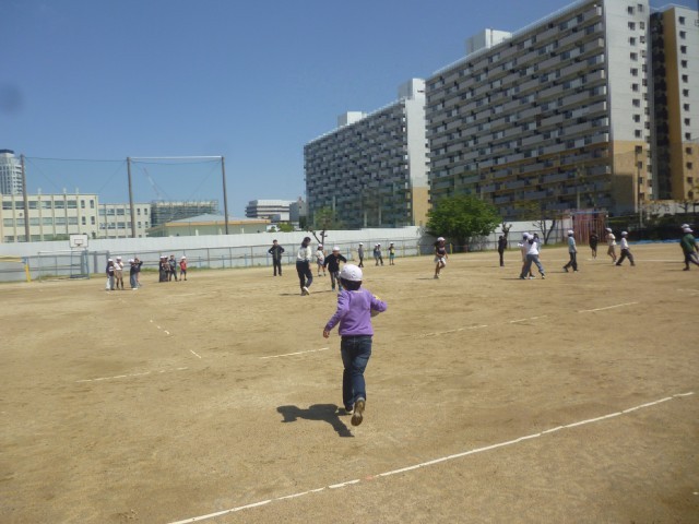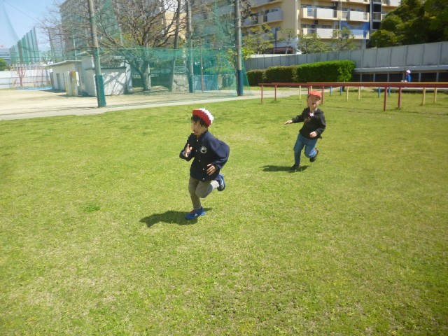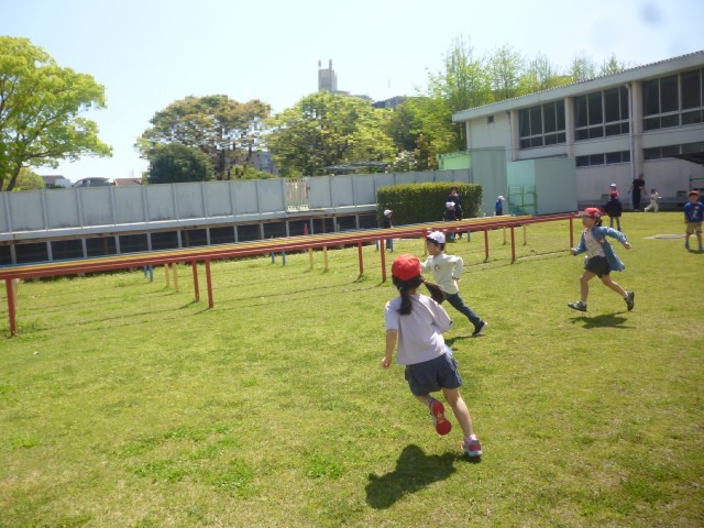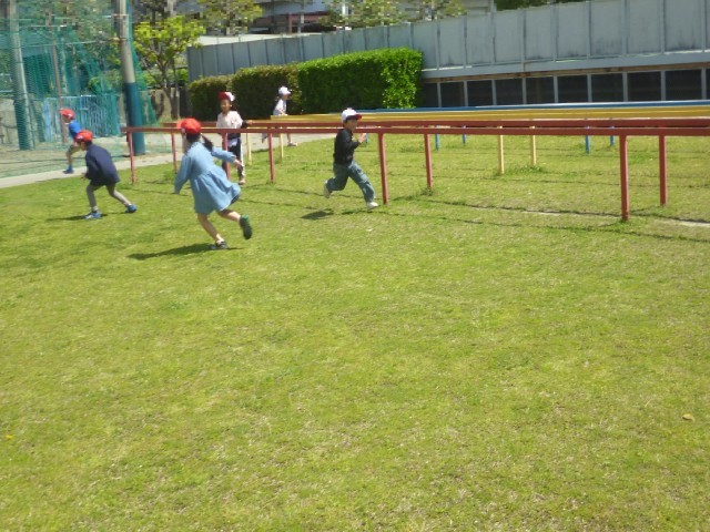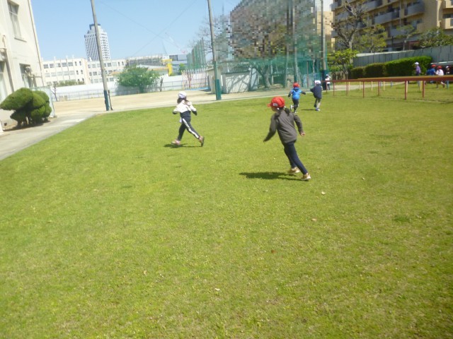 今日はいい天気です。子どもたちは元気いっぱいです。1年生もはじめての芝生広場でのあそびです。ふえおにをしてあそんでいます。