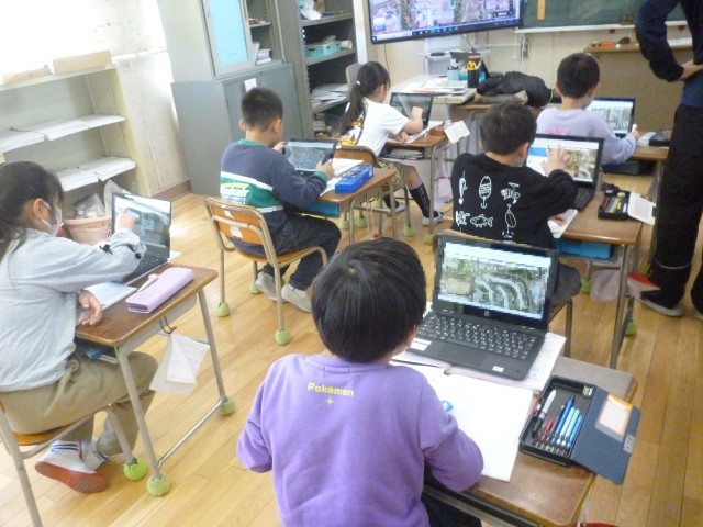通学ろには、どんな場所があるか調べています。今回は、地図アプリを見ながら調べています。