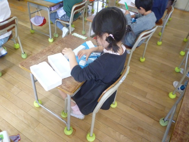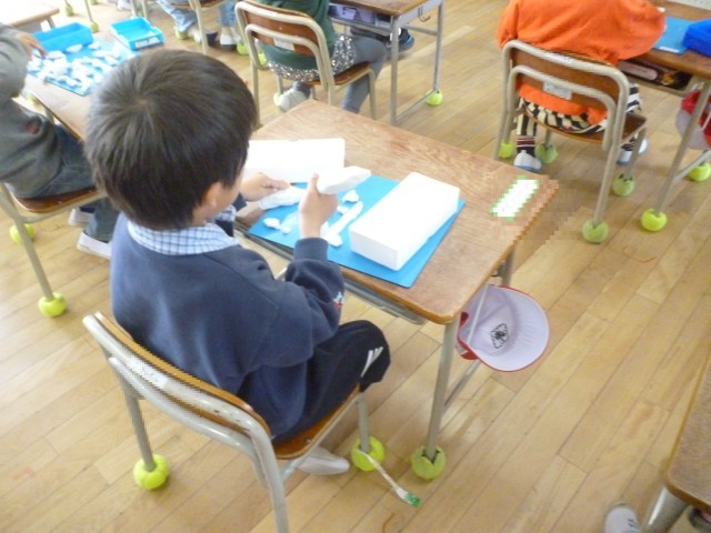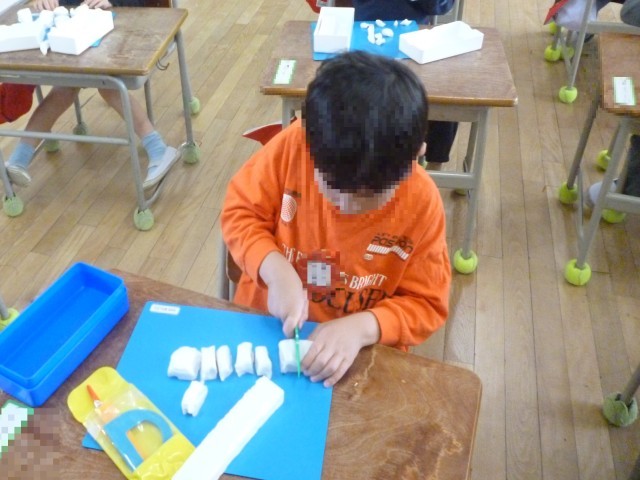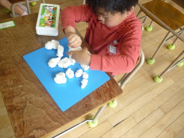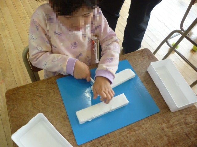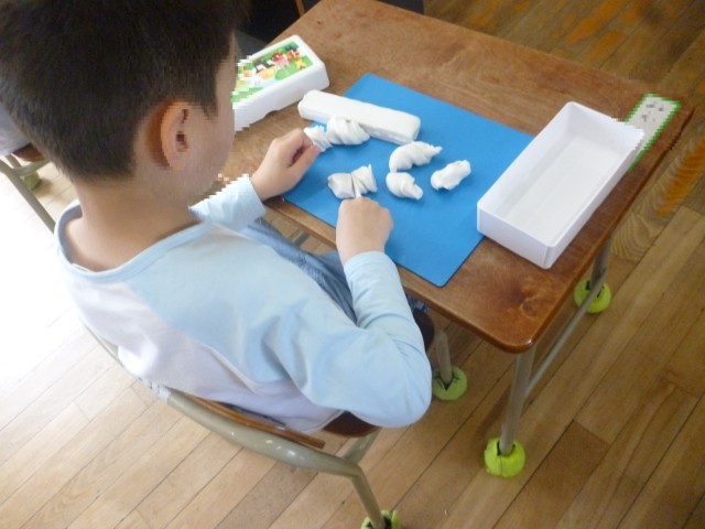 しょうがっこうで、はじめてのねんどです。きったり、まるめたり、じゆうにつくっています。