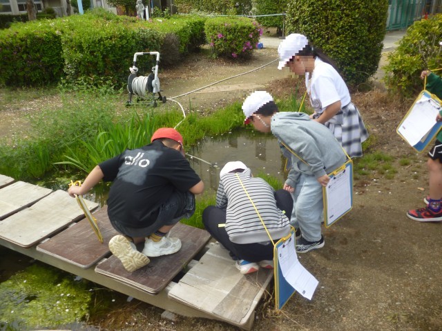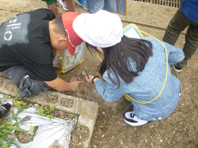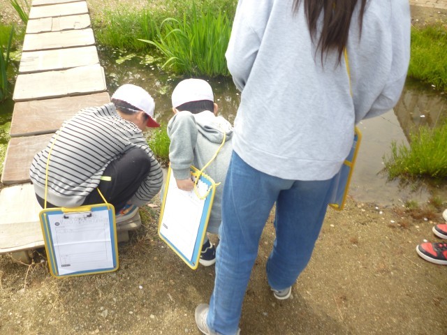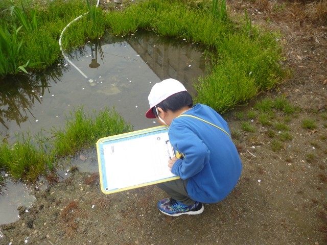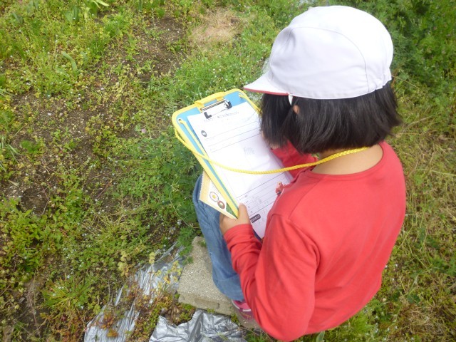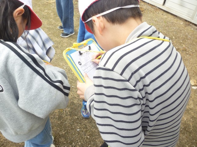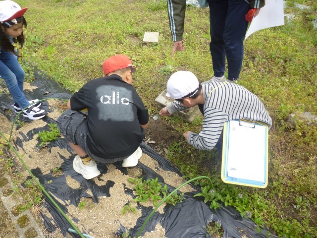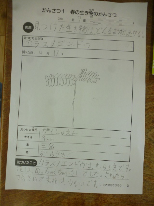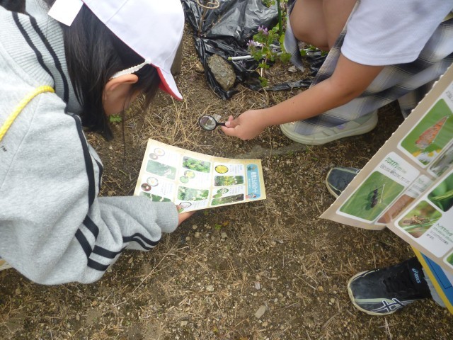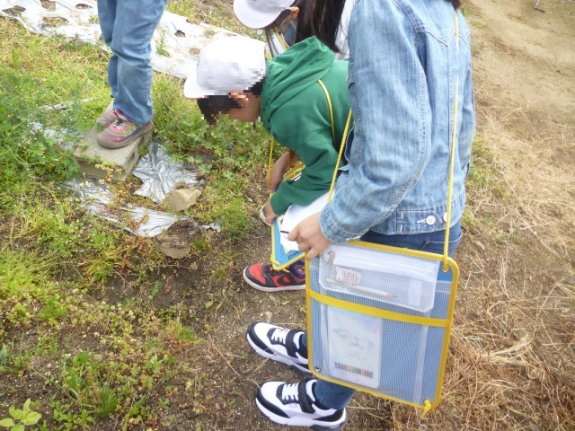 生き物のかんさつに、学習園にいきました。カラスノエンドウや、タンポポなどの草花。ダンゴムシやテントウムシなどのこん虫。いろいろな生き物をみつけることができました。
