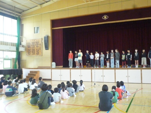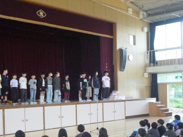 今日の児童朝会で、児童会の紹介をしました。代表委員児童と、各委員会の委員長さんが、自己紹介と、抱負をのべました。全校児童の前で、たいへん立派に言えました。これからの活躍に期待します。
