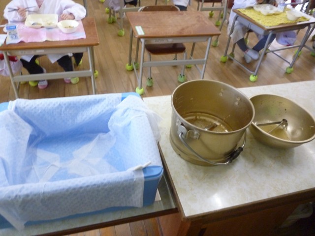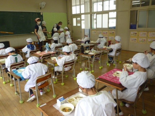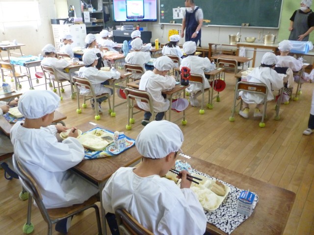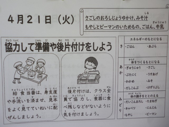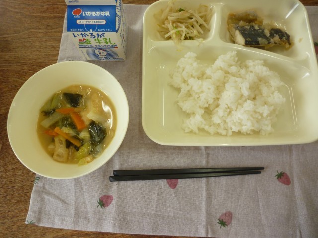 今日のこんだては、さごしのおろしじょうゆかけ、みそしる、もやしとピーマンのいためもの、ごはん、ぎゅうにゅうです。1年生は、はじめてのおさかなのこんだてでした。しかし、1・2年生でかんしょくできました。