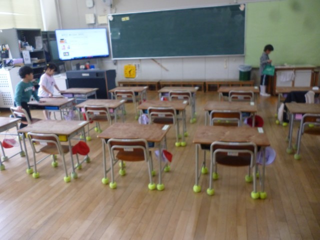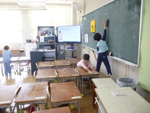 今日は、1ねんせいだけで、きょうしつのそうじです。きのう、6年生におしえてもらったことをいかし、ぴかぴかにしています。そうじめいじんめざして、みんないっしょうけんめいがんばっています。