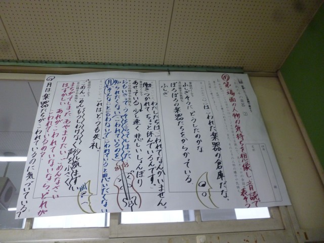 場面ごとに、登場人物の心情の変化を読み取り、音読にいかしています。