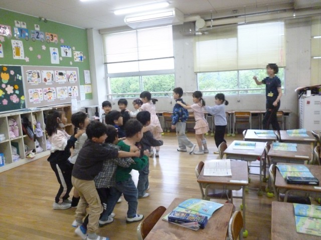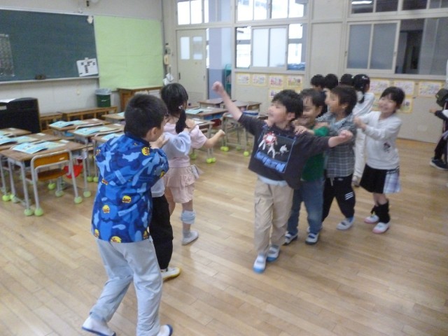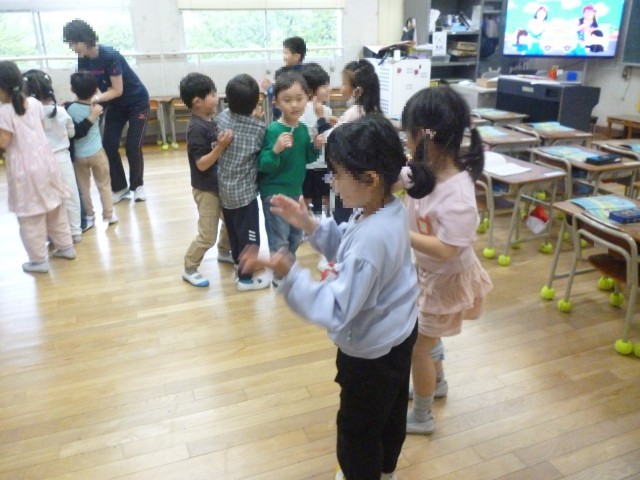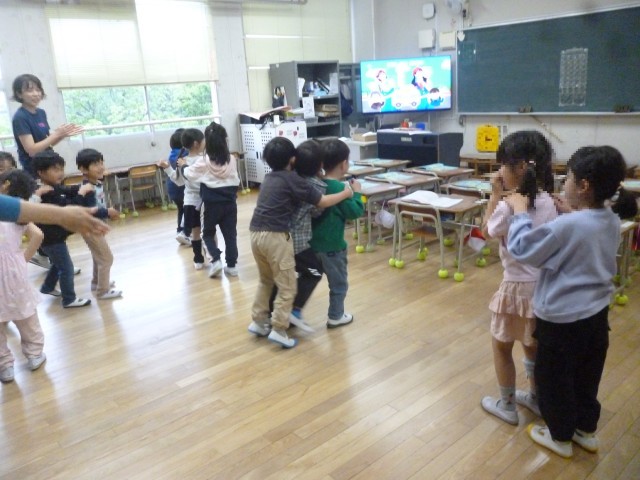 りずむにあわせて、ふりをつけてうたっています。みんなたのしくがくしゅうしています。