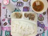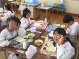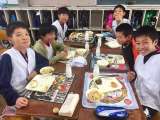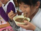 今日の給食は、お好み焼き、豚汁、きゅうりの梅風味でした。お好み焼きにつけるとんか...