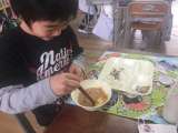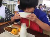 今日の給食は、なすのミートグラタン、鶏肉と野菜のスープ、みかんでした。食欲の旺盛...