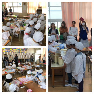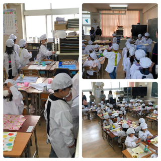 開始前から、廊下には保護者の皆さんが、たくさん来られていました。子どもたちはこれまでは6年生にサポートしてもらっていましたが、今日は自分たちだけで給食当番をします!少し大きめのエプロンや帽子を身にまとい、大きな食缶を抱えて、当番活動をがんばりました!配膳もみんなで力を合わせてできました!「いただきます!」の声とともに、食事を始めた子どもたち!お家の人が取り囲む中、少し緊張気味でしたが、食事を楽しみました!