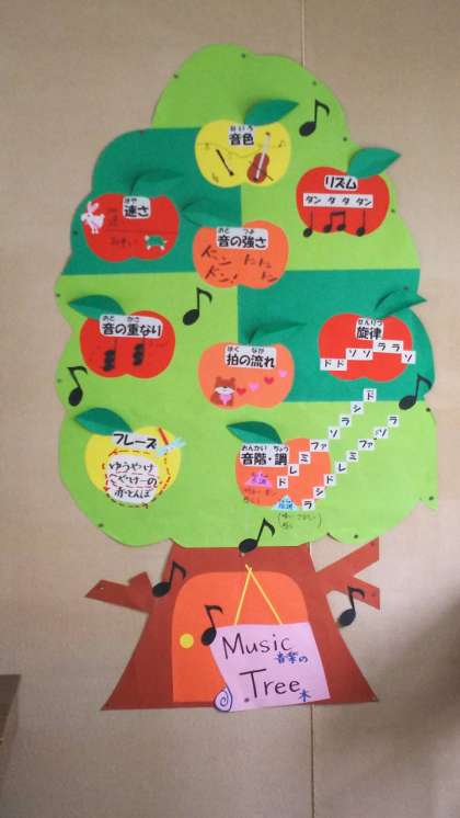 音楽室に大樹が育ちました!太い幹から出る枝葉には音楽のポイントが記されています。「音色、速さ、強さ、リズム、重なり、流れ、旋律、フレーズ、音階:調」これらのことを、「歌うとき」「演奏するとき」「つくるとき」「きくとき」のヒントにしましょう!
