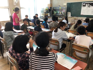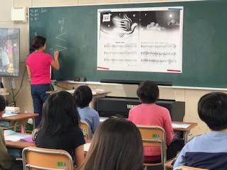 「翼をください」を学ぶ子どもたち!「mf、f、クレシェンド、デクレシェンド、v」など音楽記号を確認し合いました!友だち同士で答え合わせしながら、それぞれの意味を知り、それを意識して歌声にのせました!なかなかステキな歌声でしたよ!さすがリーダー!