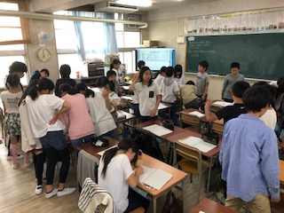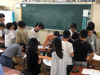 「みんなが考える十七条憲法」って?歴史学習で有名な十七条憲法!この内容を押さえながら、「このクラスにとっての十七条憲法」を一人一人が考えました!「ケンカをしても仲直りのできるクラス」「みんながゆずりあえるクラス」「何でも協力できるクラス」「学校が好きになるクラス」「ON、OFFの切り替えることのできるクラス」などなどアイデアがドンドンでます。となりの人、近くの人と考えを共有したあとは、フリータイム!!!机に広げたみんなの考えを自由に動き回って交流します!まわりながら自然と子ども同士の対話がはじまります!いい雰囲気です!