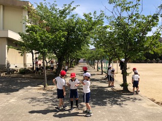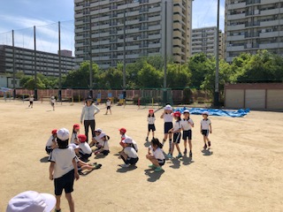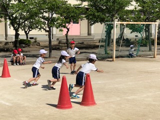 眩しいくらいにふりそそぐ太陽の下、子どもたちは50メートル走にチャレンジします!友だちと位置について!ヨーイドン!全力で走り切ります!一生懸命な子どもの顔がとってもカッコよかったです!