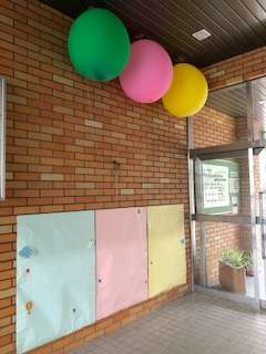 玄関の額の中から、3つの風船が飛び出した!そうです!見てください!玄関に風船が浮かんでいます!そして、その下には3色同じ色のシートが貼られています!