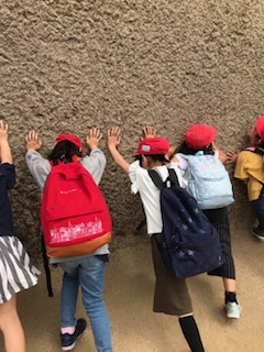 大阪城を取り巻く、お堀に近づきました!城を取り囲む石垣に圧倒される子どもたち!もちろん押してもビクともしません。重量はなんと約108トン!