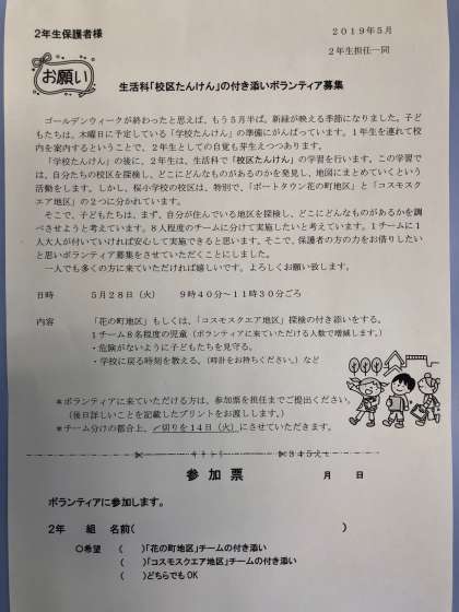 令和元年5月9日(木)生活科「校区たんけん」の付添ボランティア募集について