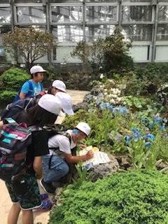 オリエンテーリング途中には、ビニルハウスに入ります!ここは涼しいエリア。高山植物が生えています。普段は見ない植物に興味津々な子どもたち!