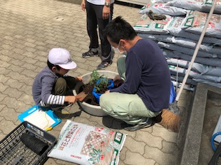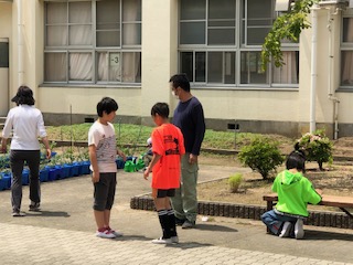 先ほどのミニトマトの植え替えには、管理作業員さんとの協働作業がありました。子どもたちは自分の鉢を出して、一緒に土入れをしていきます。また、休み時間には中庭で管理作業員さんと遊ぶ子どもの姿があります!
