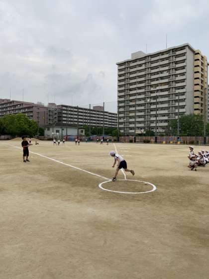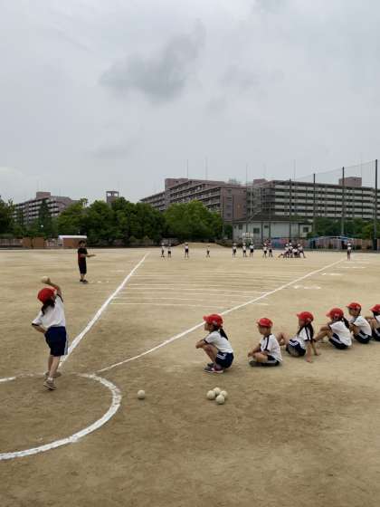 曇り空の下、子どもたちは今日からスポーツテストにチャレンジします。どこまで遠くにソフトボールを飛ばせることができるのか!子どもたちは必死になってボールに力を込めます!なかなか肘の使い方が上手な子どもがいてビックリでした!