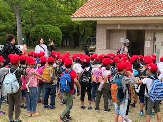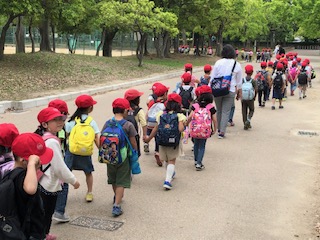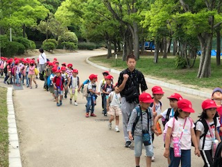 今から学校に戻ります!お腹いっぱい!遊びでいっぱい!大満足の子どもたちは、とても清々しい顔をして住之江公園をあとにします!学校まではまたこれから!帰りのニュートラムも「0の声」でがんはります