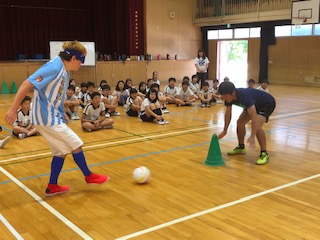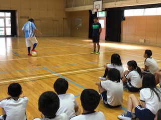 まずはデモンストレーション!お二人の講師の方がパスやシュートのお手本を披露されました!見えないのにすごい!と拍手が起きました!