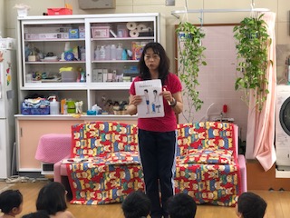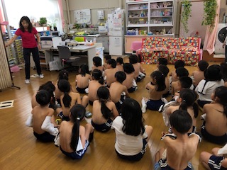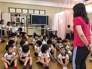 子どもたちは内科検診の方法や気をつけることを学びます。背骨の様子もチェックします。大人の話をしっかりと聞いて活動できました。