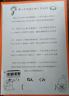 来たる5月27日(月)8:35〜8:50に、講堂で、全校音楽集会を行います。心をひとつに、みんなで、歌「切手のないおくりもの」を歌います。ぜひ、保護者の皆様、地域の皆様、子ども達や教職員とともに、素敵なハーモニーを奏でませんか。ご参加をお待ちしております。(歌詞は、大きく写しますので、気楽にご参加ください!)