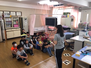 ヘッドホンをあてて、静かに音を聴きます。2種類の音域を聞き分け、鳴ったらスイッチを押し続けます。子どもたちは、説明を、しっかりと聴いて、友達のことを思いやりながら検診を受けることができました。ここでも「3つの風船」をふくらませます!
