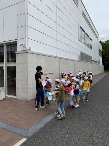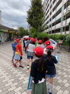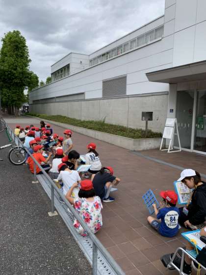 薄曇りの空の下、子どもたちは地図を見ながら、地図記号をかいていきました。実際の建物や場所を目の当たりにして、記号の表す意味や表記の仕方を学びました。子どもたちは意欲満々に鉛筆を走らせていました。
