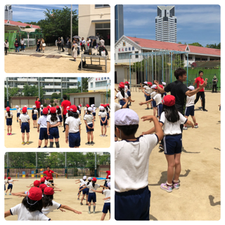 朝原さん率いる走るスペシャリストのみなさんが桜小学校に集結しました!メダリストとの出会いに子ども、いえ、大人が興奮しています!まずは準備運動!音楽のリズムに合わせて体を動かします!