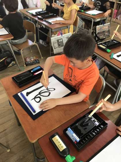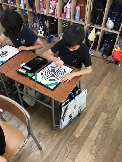 習字の準備や心構えを学んだ後は、ぐるぐる書きにチャレンジ!筆の運び方を実感します。