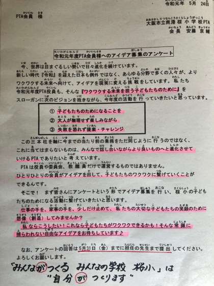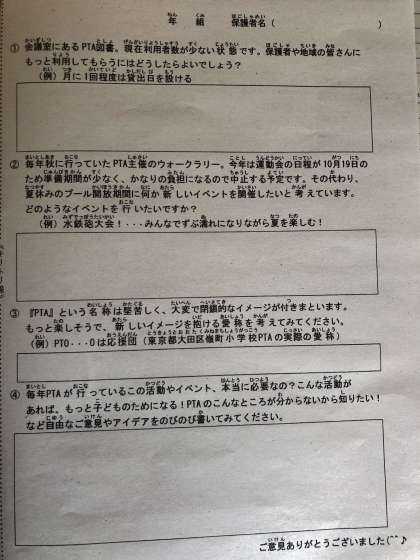 令和元年5月24日(金)令和元年度PTA会員さまへのアイデア募集のアンケート