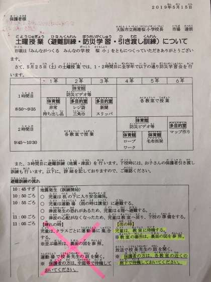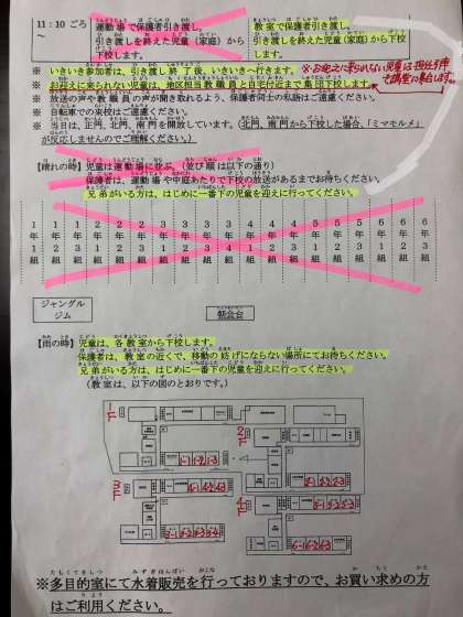 明日予定の土曜授業ですが、暑さがかなり厳しいことが予想されており、雨プロでの対応をすることになりました。よって、以前配付済の下記お手紙内の【雨の時】の流れで実施します。黄色のマーカーでお示ししている部分ですのでご確認ください。また、お迎えに来られない児童は教室から講堂へ移動後、自宅付近まで集団下校となります。