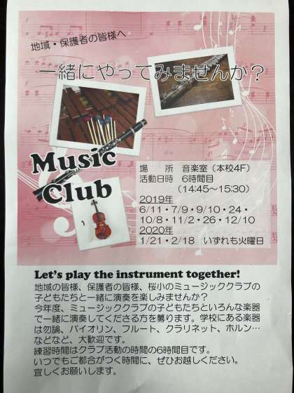 上記案内通り、ミュージッククラブ(音楽クラブ活動)では、保護者や地域のみなさんといっしょに音楽を楽しむことを企画しています!子どもたちと音を楽しみませんか?奮ってご参加お待ちしています。