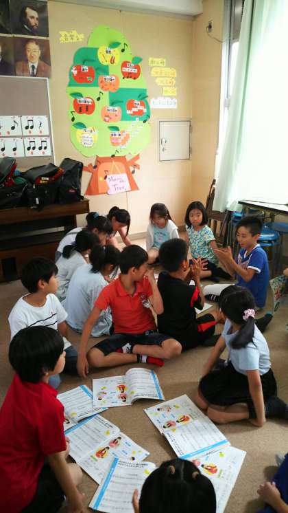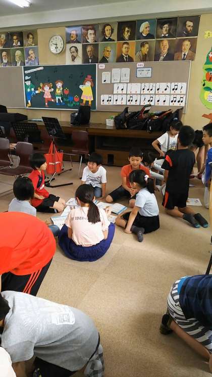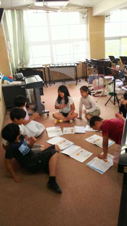 「いろんな木の実」の曲に合わせて、リズム伴奏を考えます。グループの子どもたち同士での学び合い!いろんな手拍子が聞こえてきます。曲が流れると自然と体が動きます!次回は楽器も決めて、Let's enjoy!