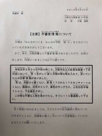 令和元年5月30日(木)不審者情報について