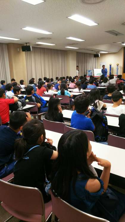子どもたちは舞洲焼却場へ学びに行きました!まずは工場の人から概要をお話いただきました。少し緊張気味の子どもたちです。