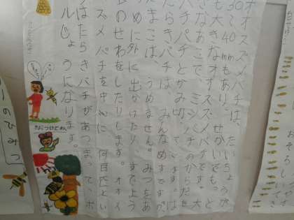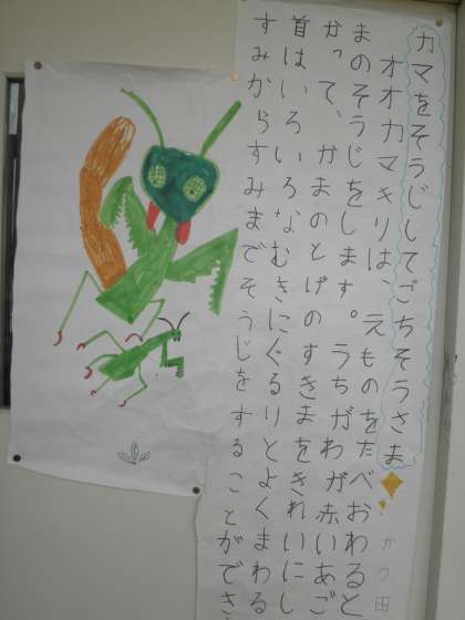 3年生の教室の前に、昆虫について調べ学習をしたものが掲示してありました。図書館の本で調べて、いろいろな昆虫について詳しく調べていました。ミツバチがオオスズメバチを撃退する方法など読んでみると「そうだったのか」と驚くような情報がたくさんありました。絵もとても上手に描いているので感心しました。