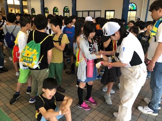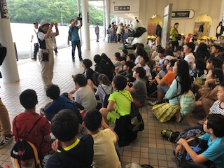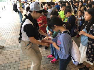 パスポートとミールクーポンをもらった子どもは、係りの人からのお話を聞きます!今日は天気の関係で外の乗り物が休止されるとのことでした。その後、手首にアトラクションパスをつけてもらいました!さあ!いよいよアドベンチャーワールドへ出発!