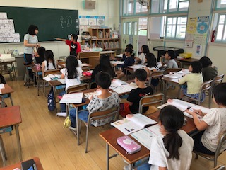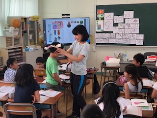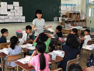 「これ何?」と見せたものは手ぬぐい!あっ知ってる!あれあれ!と子どもたちは口にするものの、なかなかその名前が出てきません!じゃあさあ、こんな使い方もあるよ!と先生が束ねてハチマキにします!それでも名前が出てきません!埃のカバーにもなるよ!お風呂でも使えるよね!と言ってるうちに、「手ぬぐい!」と出てきました!そこからはふだんの生活の中にある日本の文化をたくさん探しました!「ざぶとん、たたみ、こま、百人一首、着物、凧揚げ、ゆかた、げた、けん玉、ぞうり」などなど出てくる出てくる!子どもたちの発想は止まりません!守りたい日本の文化をテーマに学んだ1時間でした!