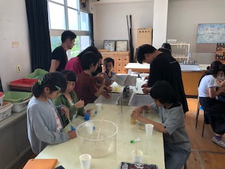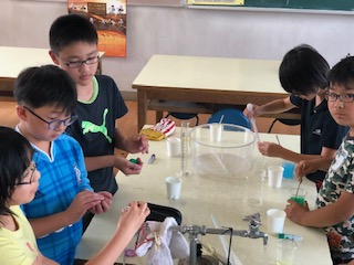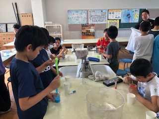 理科室では何やら得体の知れない物体を子どもたちが触っていました。そう「スライムづくり」です。色とりどりのスライムを子どもたちは楽しそうにつくっていました。