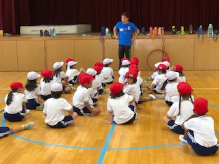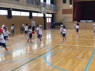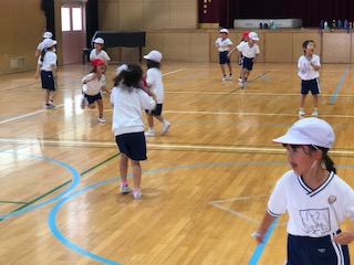 運動場にいると講堂から子どもたちの楽しそうな声が聞こえてきました。覗いてみると、子どもたちがライン鬼ごっこを、してました。線の上しか動けないルールで鬼ごっこを楽しんでいます。いざ集合!となるとあっという間に集まれる子どもたち!集中力は抜群でした!