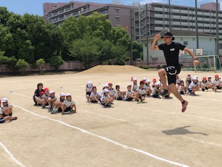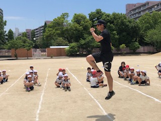 高い!すごい!もう一回やって!と子どもたちから歓声が上がりました!コーチがももをあげて高く真上に跳び上がる学習の時でした。やはり、違いますね!当然ですけど!子どもたちは本物との出会いに感動とともに、自分もやってみたい!やってみよう!とテンションを上げていました。