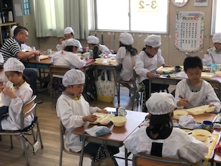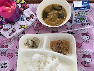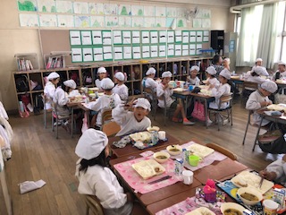 こんな感じです。桜小学校の給食は自校炊飯でいつもあったかくて美味しくいただいています!子どもたちは給食の時にはまた違う顔を見せます!みんなとっても楽しそうに食事をしています。食べるの「食」という漢字は「人+良」です。つまり、食べることは人と人の関係を良くします。楽しく食事しようね!