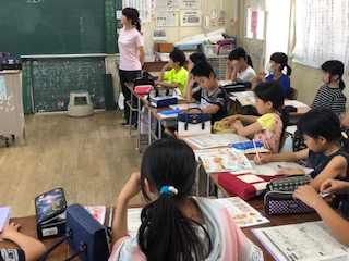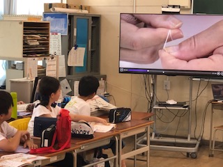 5年生では家庭科をシャフル授業で学んでいます。モニターに映し出された映像から玉結びや玉止めについて学びました。映像を通すことで、よりイメージがわきやすくなり、仕方についてもよりスムーズになります!なんだかあったかい子どもたちのやりとりに心がほっこりしました!