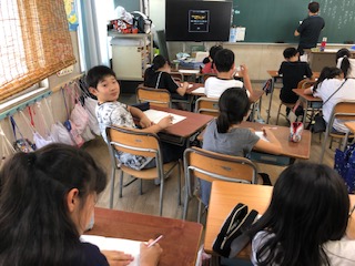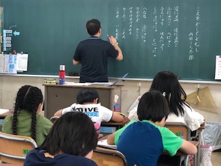 ここでのシャッフル授業は国語!詩を学んでいます!詩の音読から学習がスタート!音読と言えば、昨年度の6年生がチャレンジした「音読ボクシング」を思い出します。その「音読ボクシング」が密かなブームを巻き起こしそうです。4年生が5年生に、6年生が5年生に、いずれも挑戦状が突きつけられそうなのです!これは楽しみ!違う学年の子どもたちとの学びは、双方に効果をもたらします!相手の音読の様子から、いいところは取り込んで、真似るところは真似る!これが真似る=学びの原点!いいですね!まさに学び合う子どもたちです!