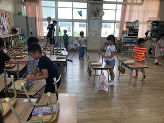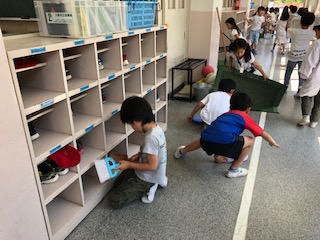 1時30分のチャイムが鳴ると、子どもたちはお掃除モードに大変身!自分から掃除場所に立ち、ホウキを持ったり、雑巾を絞ったり、つくえを動かしたりと、自主的に掃除を始めます!身の回りを美しいと仕事の効率が上がると言われています。子どもたちにとっての仕事とは様々な授業の学びや友だちとの協力や共存での学びです。どんな環境に身を置くのか!環境は人を変えるとも言います。反対に環境に左右されない意志の強さも必要です。