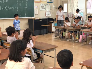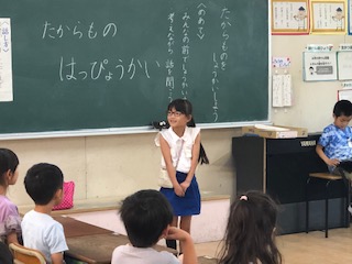いよいよ「たからものはっぴょうかい」です。「わたしのたからものはオモチャの犬です。名前はしらたまと言います」「ぼくのたからものはシールです。キラキラでかっこいいです!」などなど子どもたちは自分の大事にしているものを伝えます。途中思い出しながら伝える友だちに「がんばれ!大丈夫!」と声援を送る優しい子どもたちです!